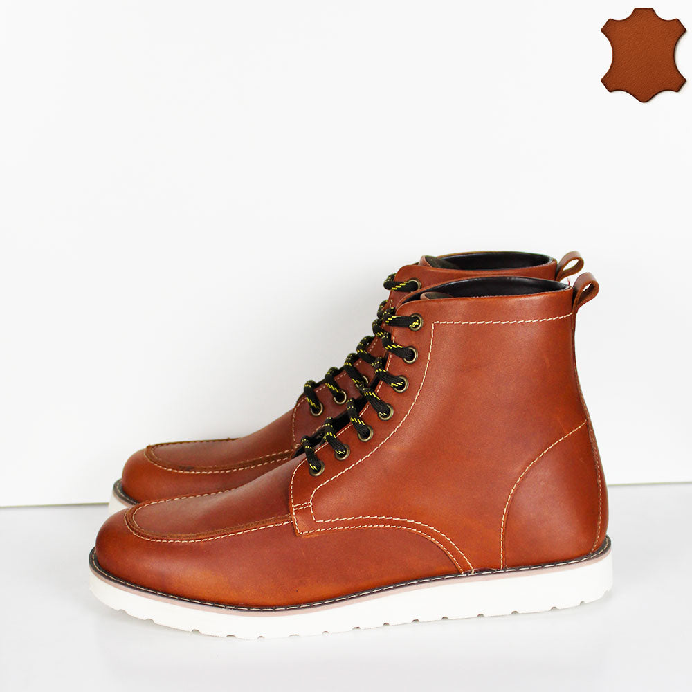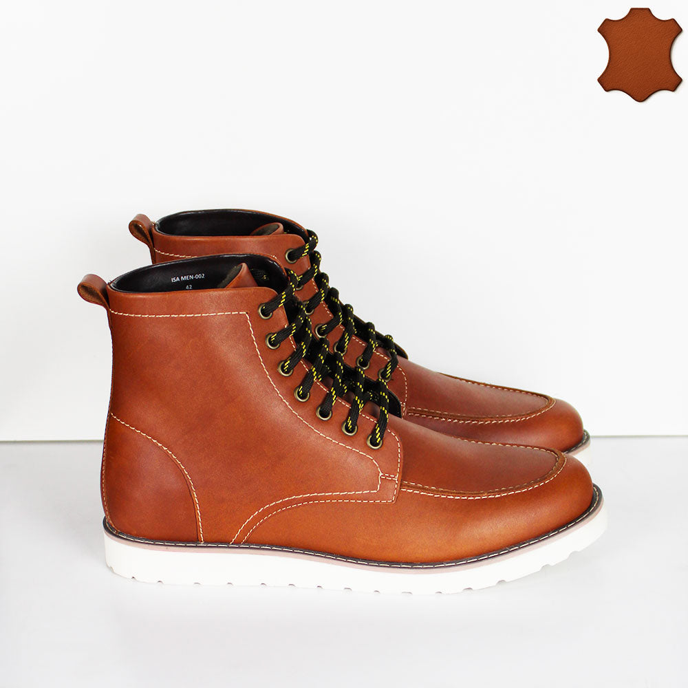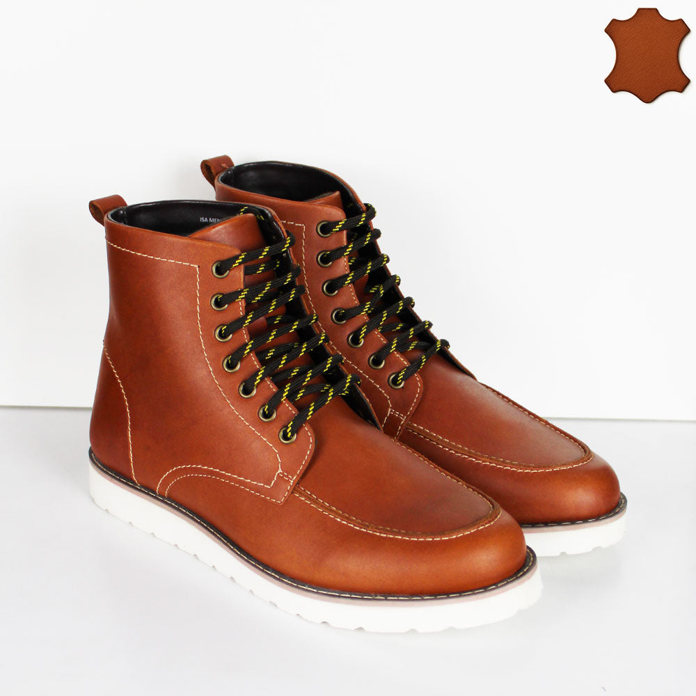 Eleganti stivaletti da uomo stringati in pelle color tan, caratterizzati da una tomaia morbida e resistente che garantisce comfort e stile. Il sottopiede in pelle assicura traspirabilità e un calzata confortevole durante tutto il giorno, mentre la suola leggera facilita i movimenti offrendo stabilità e praticità. Ideali per chi ricerca un calzatura sofisticata senza rinunciare alla comodità.